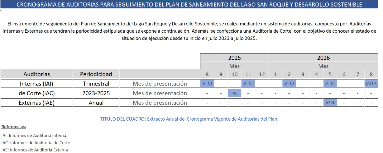 El instrumento de seguimiento del Plan de Saneamiento del Lago San Roque y Desarrollo Sostenible, se realiza mediante un sistema de auditorías, compuesto por Auditorías Internas y Externas que tendrán la periodicidad estipulada que se expone a continuación.